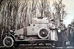 During the war those that could afford to rode into battle on their own horses, much like this (in 1914) Lieutenant Charles Henkart arranged for two of his civilian Minerva Motor Works tourers to be armoured at the Cockerill Works in Hoboken.[9] The initial armoured cars were ad hoc but soon Minerva had created a standard design. American papers were reporting the use of the armoured car by September 1914.[10] The crew was partially exposed to gunfire with the open top. This would prove fatal to Lieutenant Henkart when on September 6, 1914 he was killed by gunfire after the armoured car he was in was caught in a German ambush.[11][12] Before the Minerva factory was captured during the German invasion and occupation of Belgium about thirty Minerva armored cars were built. In 1916 the design of the original armoured car was completely revised. The open top was now fully enclosed and the machine gun under an armoured cupola. The Belgian Army used the cars as motorised cavalry units with three-car platoons. The armoured car units were mostly used for reconnaissance, infantry fire support and missions behind enemy lines.[13] After the Western Front became bogged down in trench warfare some of the cars were sent to the Eastern Front with the Belgian Expeditionary Corps in Russia.[13]
