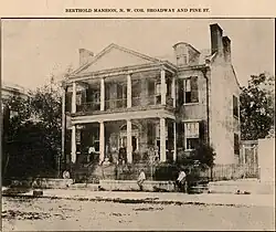Through March and April the members of the Minutemen continued to recruit members, prepare for war, and confront their Unionist opponents in St. Louis. One incident nearly led to bloodshed. In the early morning of March 4, 1861, members of the organization raised "secessionist" flags over the St. Louis Courthouse and their Berthold Mansion headquarters.[8] Although the flag at the courthouse was quickly removed, the flag at Berthold Mansion continued to fly. Pro-Union activists, feeling provoked by the "secessionist" symbol demanded its removal and attempted to enter the building to take it down. The confrontation lead to scuffles and could have escalated to armed violence except for the intervention of the Mayor and several prominent St. Louis Unionists. The "secessionist" flag would continue to fly through May.[9]