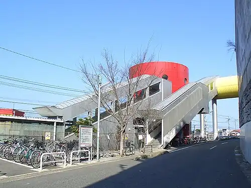 The station consists of a side platform serving a single track. The station building is a modern structure in elevated format. It resembles a vertical red barrel built over the track and houses the ticket window. From there a flight of steps leads down to the platform. There are two entrances to the barrel shaped station building. From the access road, a flight of steps leads up to the red barrel. A second entrance is located in the environs of a residential area south of the station on higher ground. Here the entrance is a yellow tube-shaped tunnel which leads to a fight of steps connecting to the red barrel. Unlike most hashigami designs, it is not possible to enter the station building from the other side of the tracks.[3][2][5]