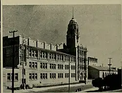 In 1922, the original Mission High School was destroyed by fire.[10] The present Mission High School complex was then constructed in a California Churrigueresque style between 1925 and 1927, during the height of San Francisco's "Golden Age" of school construction. John W. Reid Jr., San Francisco's City Architect, was the designer.[11] The elaborate ornamentation on the school is likely due in part to the visual proximity to the nearby Mission Dolores Basilica, which features towers and ornamentation in the Churrigueresque architectural style.