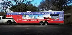 - ^ Photo features a 40 ft trailer attached to a pickup truck, with colorful images on the side to show what exhibits the museum houses. These images include: a hurricane for weather, a fighter jet for aerodynamics, an athlete with a J-leg prosthetic for biotechnology, wind turbines on a hillside for energy, and the International Space Station for space