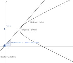In particular, if the risk-free return is greater or equal to , then the tangent portfolio does not exist. The capital market line (CML) becomes parallel to the upper asymptote line of the hyperbola. Points on the CML become impossible to achieve, though they can be approached from below.
