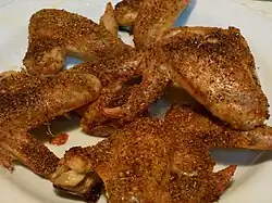 Montreal steak seasoning, also known as Montreal steak spice,[1] is a spice mix used to flavour steak and grilled meats.[2] It is based on the dry-rub mix used in preparing Montreal smoked meat,[2] which comes from the Romanian pastramă (the ancestor of pastrami), introduced to Montreal by Romanian Jewish immigrants.