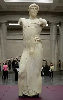 When the sculpture was toppled in antiquity, both arms were snapped off and lost, as were the legs below the shins. The face is also heavily damaged and the head was snapped off at the neck, but it has been reattached by archaeologists.[3]