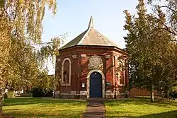 The 1722 chapel of St James, by William Sands, senior of Spalding, was a rebuild of an earlier chapel, and was enlarged in 1886. In 1896 Moulton Chapel became a separate ecclesiastical parish under the name of Moulton St James.[3] Pevsner notes the church as a red-brick octagon with a chancel added in 1886, and a domed interior. The style is Dutch, influenced by late 17th-century fen drainers. There is a marble font, and a west gallery probably from the 19th century.[4] St James' is a Grade II* listed building.[5]