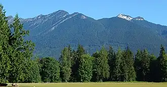 Mount Higgins is a 5,176-foot-elevation mountain summit located at the western edge of the North Cascades Range, in Skagit County, Washington.[3] Mount Higgins has two subsidiary summits, Skadulgwas Peak (4,986 ft) which is the fin-shaped middle peak, and also Mount Higgins Lookout Site (4,849 ft), the western sub-summit. The mountain is set on land administered by the Mount Baker–Snoqualmie National Forest. Mount Higgins is situated along the north side of State Route 530, mid-way between the communities of Darrington and Oso, near the site of the 2014 Oso mudslide. The nearest higher neighbor is Round Mountain, 0.93 miles (1.50 km) to the north-northeast.[1] This mountain is named for Oso homesteader Walter Higgins.[4] The first ascent was made in 1888 by John Higgins, Frank Lawrence, and Al Baker.[5] Precipitation runoff from Mount Higgins drains into tributaries of the Stillaguamish River. Topographic relief is significant as the south aspect rises 4,800 feet (1,500 m) above the Stillaguamish in two miles.