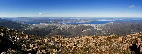 ![]() Mount Wellington viewed from Lindisfarne Bay on the Eastern Shore of the River Derwent, with its seasonal snow cap visible | |