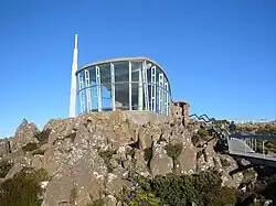 Mount Wellington was selected by many broadcasters as the site of radio and television transmitters as it provides line-of-sight transmission to a large area of Hobart and surrounding districts. Two steel lattice towers were erected in 1960 to deliver television services to Tasmania, these being a 104m tower known as the Post Master General tower (PMG tower) and another owned by WIN Corporation, the latter still present today.[13] The PMG tower faced significant issues with snow and ice, and in 1982 a radome was added to protect the tower's antennas.[14] Planning for a replacement tower began in the late 1980s, and in 1993 plans were finalised for a new 131m concrete and steel tower to withstand the mountain's harsh weather conditions.[15] Between 1994 and 1995, the new concrete and steel Broadcast Australia tower (NTA tower) was constructed, leading to the PMG tower being demolished in January 1997.[16] The NTA tower broadcasts all of Hobart's high-power FM radio stations, plus the digital TV services for ABC and SBS. It also has a small accommodation area at its base, with a kitchen and workshop area. The WIN tower broadcasts the digital TV services for Southern Cross, WIN Television, and Tasmanian Digital Television. The site also contains some data links from local Hobart businesses. An amateur radio repeater is also installed on the mountain.