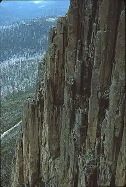 The mountain rises 1,271 metres (4,170 ft) above sea level[1] and is sometimes covered by snow, even in summer, and the lower slopes are thickly forested, but crisscrossed by many walking tracks and a few fire trails.[4] There is also a sealed narrow road to the summit, about 22 kilometres (14 mi) from Hobart central business district. An enclosed lookout near the summit has views of the city below and to the east, the Derwent estuary, and also glimpses of the World Heritage Area nearly 100 kilometres (62 mi) west. From Hobart, the most distinctive feature of Mount Wellington is the cliff of dolerite columns known as the Organ Pipes.