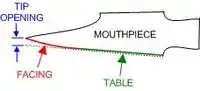 The facing (or lay) is a curved section that leaves the flat table and continues to the tip of the mouthpiece. The length of a facing—defined as the distance from the tip of the mouthpiece to the point where the reed and mouthpiece meet—can vary.[2] Different facing lengths have different response properties.