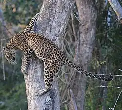 A survey carried out between November 2008 and February 2009 revealed that about 29 Indian leopards (Panthera pardus fusca) and 19 Bengal tigers (P. tigris tigris) lived in the park's core area of 107 km2 (41 sq mi).[25] As of 2018, the tiger population in the wider Mudumalai Tiger Reserve was estimated to comprise 103 resident individuals.[12] Jungle cat (Felis chaus), rusty-spotted cat (Prionailurus rubiginosus) and leopard cat (P. bengalensis) were recorded during camera trap surveys in 2010–2011 and 2018.[26][12] Two dhole (Cuon alpinus) packs were monitored during 1989–1993 and had home ranges of 83.3 and 54.2 km2 (32.2 and 20.9 sq mi); packs comprised between four and 25 individuals during this period.[27] Golden jackal (Canis aureus), and Nilgiri marten (Martes gwatkinsii) were also recorded in 2018.[12]