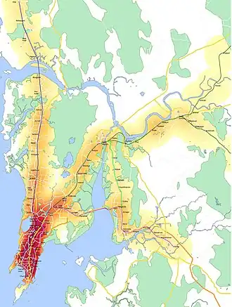 The Mumbai Suburban Railway (colloquially called local trains or simply locals)[2] consists of exclusive inner suburban railway lines augmented by commuter rail on main lines serving outlying suburbs to serve the Mumbai Metropolitan Region in India. Spread over 450 kilometres (280 mi),[3] the suburban railway operates 2,342 train services and carries more than 7.5 million commuters daily.