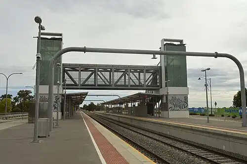 Munno Para has two side platforms and is serviced by Adelaide Metro. Trains are scheduled every 30 minutes, seven days a week.[5] There is a small bus interchange on platform 2, adjacent to Alawoona Rd. A pedestrian overpass is located on the northern end of the station, which includes lifts on either side.