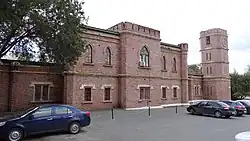 The building's main entrance is situated on the western façade and features a large trihedral avant-corps with dentils above a white stone cornice. The entrance and its adjacent windows are designed with pointed arches, typical of the Gothic style, and are bordered with relief white accents. The brick above the entrance is coloured and bears the date '1856'. The first floor has double window openings with white stone partitions, under white stone horizontal lintels with 'lugs', decorated with projecting pylons. The second storey of the northern facade also has Gothic lancet windows with lintels and weights. The northern facade is decorated with corner turrets, and the central risalite has dentils.[4][5]