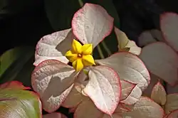 Mussaenda erythrophylla, commonly known as Ashanti blood, red flag bush and tropical dogwood, is an evergreen West African shrub. The bracts of the shrub may have different shades, including red, rose, white, pale pink or some mixtures. Mussaenda erythrophylla grows best in warmly temperate or subtropical areas and is semideciduous in cooler parts.[1] In its natural habitat the shrub may scramble up to 10 m (33 ft), but is kept compact under cultivation.[1] The star-like flowers of the shrub are 10 mm (0.39 in) in diameter and have a single, modified sepal.