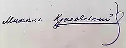 Mykola Krasovsky (Ukrainian: Микола Олександрович Красовський, Russian: Николай Александрович Красовский, romanized: Nikolay Krasovsky, 31 March 1871 - after 1934) was a police officer from Kyiv (then part of the Russian Empire), who played an important role as investigator during the Beilis affair, a criminal process spurred by antisemitic attitudes prevalent during that era. After the fall of Tsarism Krasovsky entered the service of the newly proclaimed Ukrainian People's Republic, becoming the chief of Ukrainian counterintelligence. For his investigatory activities Krasovsky was compared by his contemporaries to Lecoq.[1]