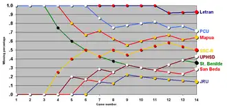 - ^ All of Letran's wins were forfeited when a player was found to have played in a ligang labas game.