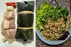 Dishes prepared with naem include naem fried with eggs, and naem fried rice.[5] Naem phat wun sen sai khai is a dish prepared with naem, glass noodles and eggs, among other ingredients such as spring onions and red pepper.[14] Nam khao is a salad dish in Lao cuisine prepared using Lao fermented pork sausage, rice, coconut, peanuts, mint, cilantro, fish sauce, and lemon juice.[15] Naem and rice are formed into balls, deep-fried, and then served broken atop the various ingredients.[16] Serenade, a restaurant in Bangkok, makes a dish called the "McNaem", which consists of a duck egg wrapped in naem that is fried and then served with risotto, slaw, shiitake mushrooms, herbs, and cooked sea scallops atop crushed garlic.[17]