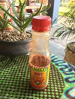 Nali Sauce is a popular sauce from Malawi dubbed, "'Africa's hottest peri-peri sauce'. It is one of Malawi's most popular sauces.[1] The Nali sauce brands have attained cult status with chilli lovers both in Malawi and throughout the world for their hotness and taste.[2] The heat level of Nali sauce is approximately 175.000 scoville heat units[3]