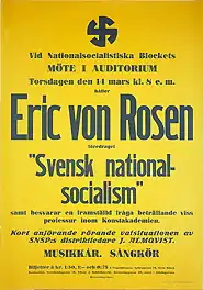 NSB poster from 1935, announcing a meeting with Eric von Rosen as main speaker.Flag of National Socialist Bloc.