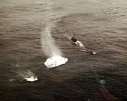 While the covering force engaged El Hank Battery west of Casablanca, seven ships of the French 2nd Light Squadron sortied from Casablanca harbor at 09:00[25] under cover of a smoke screen to attack the troopships anchored off Fedala to the east.[24] The French destroyer Milan sortied with destroyers Fougueux and Boulonnais. At 09:20, the French squadron was strafed by fighter planes from Ranger.[25] French gunners sank a landing craft and scored hits on Ludlow.[28] Milan beached after being damaged by gunfire from Wilkes,[29][30] Wichita, and Tuscaloosa.[23] Massachusetts and Tuscaloosa engaged the French destroyers Fougueux at 10:00 and Boulonnais at 10:12.[30] Fougueux sank at 10:40.[28] The French light cruiser Primauguet sortied with flotilla leader destroyer Albatros and destroyers Brestois and Frondeur. Engaged by Massachusetts, the Primauguet force was outgunned; Primauguet had been under refit and was not fully operational but returned fire nonetheless. The French flotilla was also engaged by Augusta and Brooklyn from 11:00 to 11:20.[30] Albatros beached to avoid sinking. The remaining ships returned to Casablanca harbor where Primauguet beached and burnt out and the two destroyers capsized. Forty-five crew members were killed aboard Primauguet, and more than 200 more wounded. The French submarine Amazone missed Brooklyn with a salvo of torpedoes.[23][29] Sibylle disappeared on a patrol station between Casablanca and Fedala, but the cause of her destruction remains uncertain.[23][31] Surviving French submarines Sidi Ferruch and Le Conquérant sortied without torpedoes to avoid destruction in the harbor. Le Tonnant managed to load a few torpedoes before leaving. Augusta sank Boulonnais[23] at noon[28] and the only French destroyer remaining operational was L'Alcyon.[24][28]