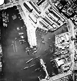 The French submarines Amazone, Antiope, Méduse, Orphée and Sibylle sortied to defensive patrol stations at 07:00.[25] At 07:50,[note 4] French fighters rose to intercept a force of bombers from Ranger and Suwanee. The French fighters were engaged by fighters from Ranger in a dogfight that felled seven French and four[24] or five[25] American planes. Bombs started falling on Casablanca Harbor at 08:04.[note 4] Ten civilian freighters and liners were sunk[25] and French submarines Amphitrite, Oréade, and La Psyché were destroyed at their moorings before they could get underway.[23] The American covering force of Massachusetts, Wichita and Tuscaloosa screened by destroyers Mayrant, Rhind, Wainwright, and Jenkins appeared offshore and Massachusetts's 16 in (406 mm) guns were added to the bombardment.[25] The El Hank battery observed gunfire from the covering force and straddled Massachusetts with its first salvo. The operational turret aboard the incomplete battleship Jean Bart also opened fire and was targeted by Massachusetts. Jean Bart had fired only seven rounds before Massachusetts's fifth salvo jammed the turret rotating mechanism on Jean Bart. Massachusetts's heavy 16-inch projectiles caused significant damage although few actually exploded because they had been fitted with fuzes manufactured in 1918.[26] The covering force then targeted El Hank Battery from 08:40[27] to 09:25.[note 4][24]