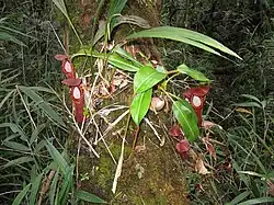 Contrary to the observations of Frederick William Burbidge,[43] N. edwardsiana grows not only as an epiphyte, but also occurs terrestrially on moss-covered rocks. It typically grows amongst ridge-top vegetation in dense mossy forest.[5] The natural habitat of N. edwardsiana is constantly moist[44] as the slopes are often enveloped in clouds.[5] Despite generally occurring epiphytically, N. edwardsiana seems to grow mostly in areas with ultramafic soils,[5] although it has also been recorded from sandstone substrates.[4]