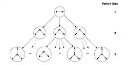 Schreiber and Schwöbbermeyer [12] proposed an algorithm named flexible pattern finder (FPF) for extracting frequent sub-graphs of an input network and implemented it in a system named Mavisto.[26] Their algorithm exploits the downward closure property which is applicable for frequency concepts F2 and F3. The downward closure property asserts that the frequency for sub-graphs decrease monotonically by increasing the size of sub-graphs; however, this property does not hold necessarily for frequency concept F1. FPF is based on a pattern tree (see figure) consisting of nodes that represents different graphs (or patterns), where the parent of each node is a sub-graph of its children nodes; in other words, the corresponding graph of each pattern tree's node is expanded by adding a new edge to the graph of its parent node.