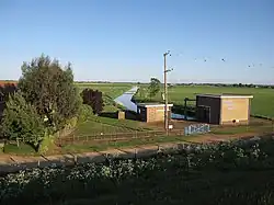 The electric station contains three submersible pumps, one of which failed in December 2012, after a period of heavy rain. With water levels in Pymoor Drain rising to record levels, the Ruston diesel engine was mended and pressed into service on 24 December. At the same time, the Oxlode pumping station suffered from the failure of a gate valve in a separate incident, resulting in one of the two pumps not being available for use.[19] Plans for a pumping station at Oxlode were originally announced in 1940,[20] but it is unclear when it was opened, as a new pumping station was commissioned in July 1944, but newspapers did not print its name, due to wartime censorship.[20] A second pumping station with two electric pumps was opened in May 1962, at a cost of £65,000. Each pump could discharge 270 tons of water per minute into the New Bedford River, but the existing two diesel pumps were retained. Prior to the opening ceremony, the Drainage Commissioners held a celebration lunch at the Club Hotel, Ely, where their predecessors had met for the first time in 1756.[21]
