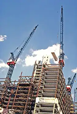 The steel superstructure was built after the elevator core. Because of the heavy traffic and densely built neighborhood, there was only a small amount of space where builders could work, and materials could not be staged nearby. The steel beams were therefore transported from a facility in Kearny, New Jersey, and then installed immediately. Work typically took place on the east side of the site during afternoons, when the theaters to the west were giving matinee productions.[31] After a protest in mid-1983 over the lack of minority workers at the site,[182] the developers hired additional minority workers to comply with a UDC rule, and several women joined the then-exclusively-male project.[183] Delays also ensued due to labor strikes and alleged sabotage; The Wall Street Journal quoted an anonymous source as saying that already-installed electrical wiring would be ripped out and that cement would be flushed down the toilet. In addition, due to threats of strikes from multiple labor unions, steel beams could not be delivered directly to the site, and workers had to pour the concrete floors on site instead of using precast concrete.[184]