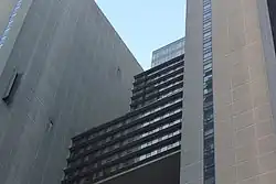 The facade is made of gray precast concrete panels with vertical stripes, which were manufactured by Canadian company Prefac-Vibrek. The lower stories' panels were installed using cranes, while the upper stories' panels were installed with a monorail assembly.[31] The precast panels are hung from steel beams that are placed around the hotel building's perimeter. Some openings were also made in the facade so exterior signs could be attached to it.[29] The windows are recessed deeply into the concrete panels, a design similar to a Venetian blind.[30]