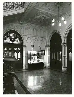 The first General Assembly Library was housed in a small room shared with the Auckland Provincial Council. It contained 750 volumes in 1860. The library then moved to a cottage behind Parliament's main building, and the collection grew to 4000 books.[4] After Parliament moved to Wellington in 1862, some books were sent down on a ship, the White Swan, which was wrecked on the Wairarapa coast. Many parliamentary papers and reference books of the inchoate library were lost.[5] The library also lost its accounts in the wreck. Premier William Fox, most of his Cabinet and government officials were on board, but there were no deaths. However, the order to jettison cases of papers and books in an effort to right the ship after it struck a reef, caused those cases to be swept into the Pacific. They were never seen again, despite pleas for their return. In subsequent years, it became common to blame the wreck of the White Swan for failure to produce documents which it was "thought inexpedient to produce".[6] The library then moved to six large rooms behind Parliament in Wellington.