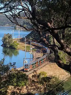 ![]() A New South Wales D set "Mariyung" travelling to Newcastle, running alongside the Mullet Creek, Brisbane Water National Park | |||||||||||||||