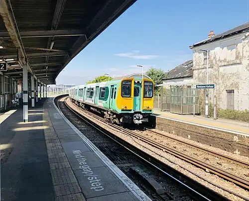 Newhaven Harbour is one of two stations serving the town of Newhaven, alongside Newhaven Town station less than half a mile (0.8 km) to the north. A third station in the town, Newhaven Marine, operated passenger services until 2006 and formally closed in October 2020.[2] Newhaven Harbour station is located on the south side of the town, adjacent to the Port of Newhaven freight terminal and nearby industrial estate.