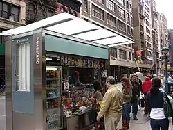 On street corners in New York City, for instance, newsstands are often shacks constructed of steel beams and aluminium siding or roofing tin; and require a city permit to build and operate. Other New York newsstands are located inside airports, hotels and office buildings – and even beneath street level in underground concourses or on subway platforms. Hudson News, a newsstand brand created in New York City, is operated by retailer the Hudson Group, with more than 500 stores around the world. This brand was created in 1987, and became more popular in the 1990s, during a time when newsstands in commuter terminals were being re-evaluated and reopened to better serve customers and the spaces with the most commuter foot traffic. Prior to this, newsstands caused limited visibility for police officers patrolling the subway stations, as well as impeding crowd movement.[9]