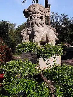 Nghê (chữ Hán: 猊) is a mythical animal in Vietnamese culture, a combination of kỳ lân (or lion) and dog, often used as a mascot in front of communal temples, temples, pagodas, shrines in Vietnam. In the countryside of North Vietnam, in front of the village gate there is always a big stone Nghê to protect the whole village, in front of the communal temple gate there is a stone Nghê, and in front of each house there is usually a small stone dog sitting in front of the guard. To keep it for the homeowner, in the southern countryside in front of the house, the guide often places a statue of a dog ceramic.