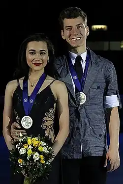 After winning the bronze medal at the 2019 Russian Junior Championships, Khudaiberdieva/Nazarov concluded the season at the 2019 World Junior Championships. They placed second in the rhythm dance, winning a silver small medal and unexpectedly beating their Russian teammates due to superior results on the tango pattern dance.[5] They came fourth in the free dance, but remained in second place overall, winning the silver medal. Khudaiberdieva said the result was not something they had expected, as "we were the number three Russian team, a confident number three though. For us, it was more about overcoming ourselves than anyone else. We haven’t realized yet that we are second at our first Junior Worlds." Noting that it was their final junior season, Nazarov said "there are many teams in Russia, but if you look at the results at major events, they are not that great. But all these teams also once came up from juniors. We just have to work very hard in order to achieve something."[6]