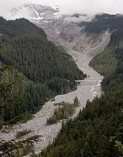 ![]() Nisqually River near Ashford during a flood in 2006 that destroyed a campground in Mount Rainier National Park | |