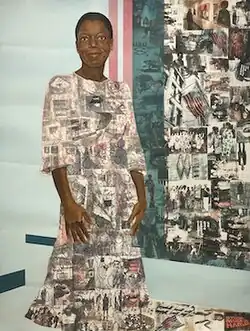 She uses photos she has taken herself in Nigeria along with family photos and pages from popular Nigerian magazines.[24] The photos "are layers in her work by collage and acetone-transfer prints, creating a fabric of images throughout her paintings".[25] Her primary mediums include collage, photo transfer, acrylic paint, charcoal, fabric, and colored pencil. Along with strong Nigerian influence, her style is also derived from pop culture, personal experience, and Western academia.[26] While creating, she thinks of her dual audience: American and Nigerian.[10] However, her work cannot be categorized as either American nor Nigerian, but rather the work is an autobiography based on her "character that doesn't fit into a box."[25]