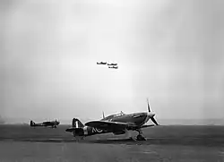 Aircraft of Fighter Command on display for the press at Grangemouth in Scotland, 25 April 1941. In the foreground is a Hawker Hurricane Mk I of No. 315 (Polish) Squadron; in the background a Bristol Blenheim Mk IF of No. 23 Squadron; and overhead, three Supermarine Spitfires of No. 58 Operational Training Unit.