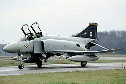After a dormancy of 13 years, No. 74 (Fighter) Squadron was reformed at RAF Wattisham, Suffolk, on 19 October 1984, with ex-US Navy McDonnell Douglas F-4J Phantom IIs (designated as the F-4J(UK) in RAF service).[13] These were purchased by the RAF as a stop-gap measure to replace those of No. 23 (F) Squadron that had been sent to the Falklands after the war.[30] The 15 F-4Js cost $125 million, and underwent a full rework at the Naval Air Rework Facility at Naval Air Station North Island, San Diego.[30] Here they received the ability to use the Skyflash air-to-air missile, their radar was upgraded, and were brought up to a spec similar to the more definitive F-4S; they were also sprayed in a distinct duck egg blue colour.[30] The F-4J(UK)s were then ferried across the Atlantic in three different batches supported by Vickers VC10s, with the last group arriving on 5 January 1985.[6] Late April and early May 1985 saw 'the Tigers' participate in their first major exercise; Exercise Priory, which sought to test UK air defences.[31][32][33] July 1985 saw a deployment out to RAF Akrotiri to undergo an Armament Practice Camp (APC); which also saw them carry out dissimilar air combat training (DACT) with Grumman F-14A Tomcats of VF-41 and VF-84 (from USS Nimitz).[34] The squadron's operational capability was declared on 31 December 1985.[35]