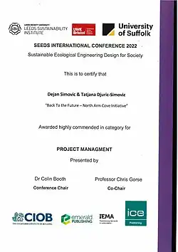 In 2022, a peer reviewed research paper by DESIM-Arch's Tatjana Djuric-Simovic and Dejan Simovic - "Back to the future - North Arm Cove Initiative" was presented at international SEEDS Conference (Sustainable Ecological Engineering Design for Society) in Bristol, UK. The paper was awarded a High Commendation in the Project Management category. A research paper has outlined a framework for planning, designing and developing sustainable communities based on Circular Economy principles. The paper contains a PESTEL analysis of constraints and opportunities for North Arm Cove's urban development, as well as proposal for innovative, collaborative development framework through "Sustainability Research Centre - SRCe".[18]