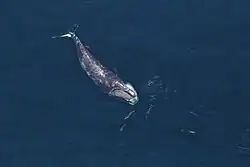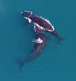 The most distinguishing feature for right whales is their callosities, rough, white patches of keratinized skin found on their heads. The right whale's callosities provide habitat for large colonies of cyamids or whale lice, which feed on the right whale's skin as these small crustaceans cannot survive in open water.[13] The relationship between cyamids and right whales is symbiotic in nature but is poorly understood by scientists. Callosities are not caused by the external environment and are present on fetuses before birth.[13] However, Cyamids near the blowhole have been linked to chronic entanglement and other injuries; their presence in this area has been used as measure of individual health in visual health assessments.[14][15]