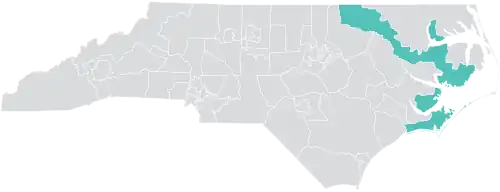 ![]() Norman Sanderson (Minnesott Beach) | Republican | January 1, 2025 – Present | Redistricted from the 1st district. | 2025–Present All of Warren, Halifax, Martin, Chowan, Washington, Hyde, Pamlico, and Carteret counties.[11] |