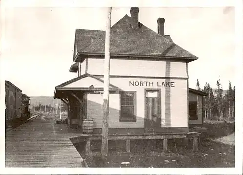 The new station was a two-storey structure with an attached freight shed that measured 46 ft × 22 ft (14.0 m × 6.7 m). It also included a wye to allow trains to turn around and reverse direction.[2] It was one of Canadian Northern's 3rd Class Stations, typical used in rural areas. This pattern was designed by architect Ralph Benjamin Pratt and first introduced in 1901 as plan 100-3. North Lake utilized the updated Plan 100-29 which debuted in 1907 and resulted in a slightly larger station.[4]