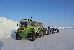 On 1 March 2013 the Russian Marine Live-Ice Automobile Expedition (MLAE 2013) with Vasily Elagin as a leader, and a team of Afanasy Makovnev, Vladimir Obikhod, Alexey Shkrabkin, Andrey Vankov, Sergey Isayev and Nikolay Kozlov on two custom-built 6 x 6 low-pressure-tire ATVs—Yemelya-3 and Yemelya-4—started from Golomyanny Island (the Severnaya Zemlya Archipelago) to the North Pole across drifting ice of the Arctic Ocean. The vehicles reached the Pole on 6 April and then continued to the Canadian coast. The coast was reached on 30 April 2013 (83°08N, 075°59W Ward Hunt Island), and on 5 May 2013 the expedition finished in Resolute Bay, NU. The way between the Russian borderland (Machtovyi Island of the Severnaya Zemlya Archipelago, 80°15N, 097°27E) and the Canadian coast (Ward Hunt Island, 83°08N, 075°59W) took 55 days; it was ~2300 km across drifting ice and about 4000 km in total. The expedition was totally self-dependent and used no external supplies. The expedition was supported by the Russian Geographical Society.[57]