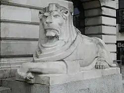 Much of the external statuary is by Joseph Else (1875–1955), Principal of the Nottingham School of Art (now part of Nottingham Trent University). Else was responsible for the famous lions guarding the entrance, for the frieze above the Ballroom windows (representing ancient local industries such as bellfounding and alabaster) and for the figures in the principal façade's pediment (depicting the arts and public service). A pub overlooking the Square is now named after Else.[15]