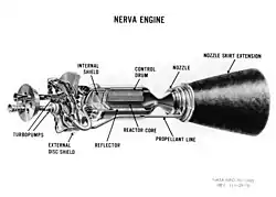The Nuclear Engine for Rocket Vehicle Application (NERVA; /ˈnɜːrvə/) was a nuclear thermal rocket engine development program that ran for roughly two decades. Its principal objective was to "establish a technology base for nuclear rocket engine systems to be utilized in the design and development of propulsion systems for space mission application".[2] It was a joint effort of the Atomic Energy Commission (AEC) and the National Aeronautics and Space Administration (NASA), and was managed by the Space Nuclear Propulsion Office (SNPO) until the program ended in January 1973. SNPO was led by NASA's Harold Finger and AEC's Milton Klein.