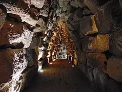 Santu Antine is constructed of huge basalt blocks. The main tower originally reached a height of 23–24 metres (75–80 ft) and contains three tholoi chambers on top of each other. The central tower with diameter of 15 metres (50 ft) is 17 metres (55 ft) high. It has three floors. The top floor is now gone. Multiple 27 metres (90 ft) long corridors built with the corbel arch technique can be observed inside of the Nuraghe, superimposed on two floors. In addition to the towers, the nuraghe featured three wells.[1]