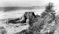 In the early 1800s, the beach that would become Nye Beach was demarcated to the south by the Yaquina River and a rocky outcropping known as Jump-off Joe. In those days, Jump-off Joe extended into the sea and posed an obstacle to beach traffic. By the mid-20th century, coastal erosion had caused the sea stack to separate from the cliff, develop an arch, and finally crumble, leaving only a scattering of rock formations to mark the spot.[2] Without this natural barrier nothing remains to separate Nye Beach from Agate Beach State Recreation Site to the north.[3]
